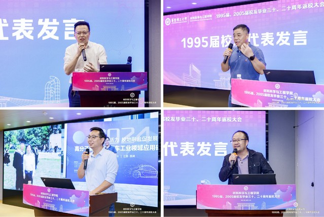 在校友代表发言环节,复材910班,核工业第八研究所总工程师、副所长徐哲军围绕“感悟、感谢、祝福”三个关键词交流,由衷感谢母校的培养,他谈到,华理为行业输送了大量专业人才,结合自身工作实践,就材料学科发展如何顺应时代变革交流了见解。材911班,度亘核芯光电技术(苏州)股份有限公司总裁张艳春回顾了在华理的求学时光,高度认同学校注重学生全面发展的育人理念,结合个人职业成长经历,他指出材料领域创新空间广阔,呼吁广大校友将个人成长与学校学院发展紧密融合。高材014班,上海芳瑜新材料科技有限公司总经理韩晓波,结合屏幕上的两张合影,以“三个心愿”为主线,分享了重返母校的感悟与个人发展历程,他表示将始终铭记投身材料行业的初心,以踏实的心态做好每一件事。无材011班,上海大学教授杨光深情回忆了在华理的学习与科研岁月,他谈到,毕业后与校友合作倍感亲切,彼此间深厚的信任感正是母校所赋予的宝贵财富。