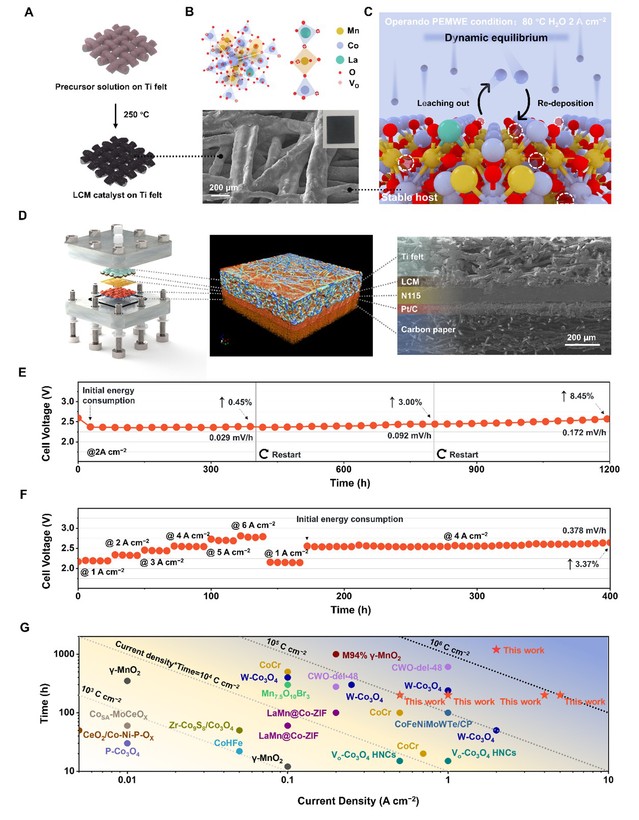 Recently, the Clean Energy Materials and Devices Team from the School of Materials Science and Engineering of our university has made new progress in the research field of non-precious metal anode catalysts for proton exchange membrane water electrolysis (PEMWE). The team successfully developed a lanthanum-doped cobalt-manganese oxide (LCM) anode material with self-healing function, which achieved stable operation for up to 1200 hours under industrial-level current density. The relevant research results were published online in Energy & Environmental Science under the title A self-healing non-precious metal oxide anode in proton exchange membrane electrolysis beyond 1000 h stability at 2 A cm−2.