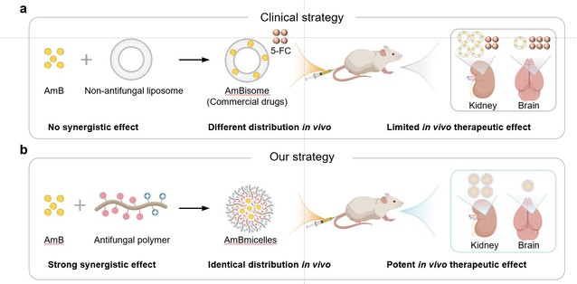 Recently, the research group led by Professor Liu Runhui (Shangsi Exploration Scholar) from the School of Materials Science and Engineering of our university has reported a strategy of synergistic and co-delivery of drugs based on host defense peptide mimetic assemblies. The developed synergistic co-delivery system can effectively treat systemic fungal infections and fungal meningitis.